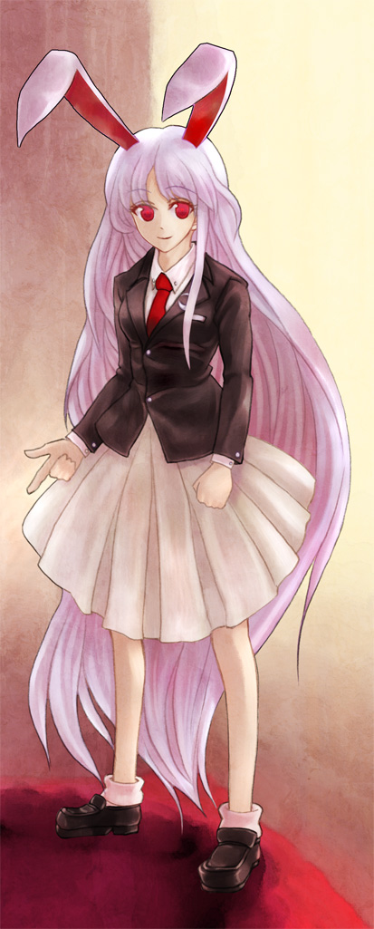 1girlanimal earsblazerfemale focusfinger gunfull bodyjacketloaferslong hairnecktiepleated skirtpurple hairrabbit earsred eyesshoesskirtsockssolovery long hair