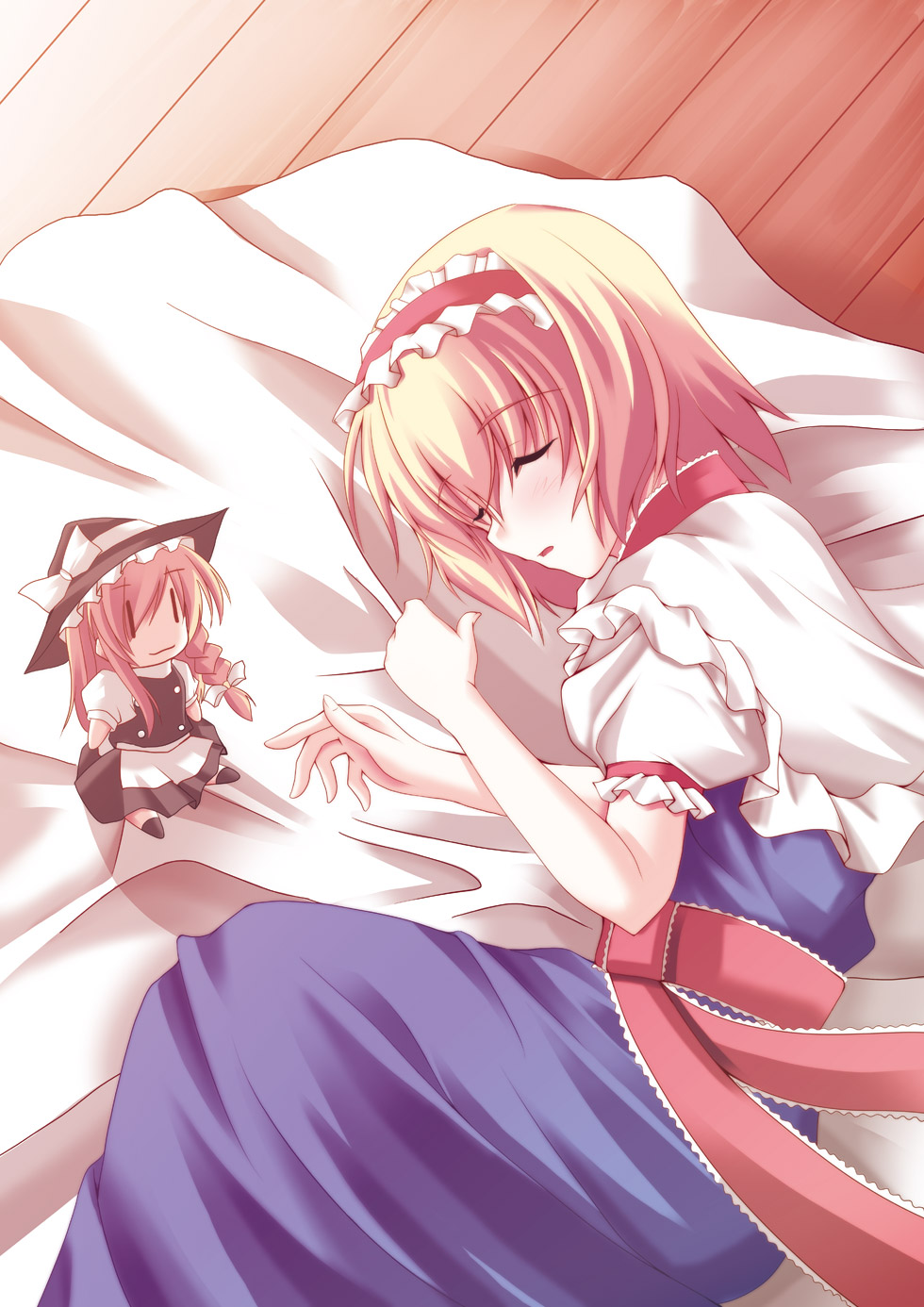 1girlblonde hairblushcharacter dollclosed eyesdollfemale focushairbandlyingon sideribbonshort hairsleepingsolo