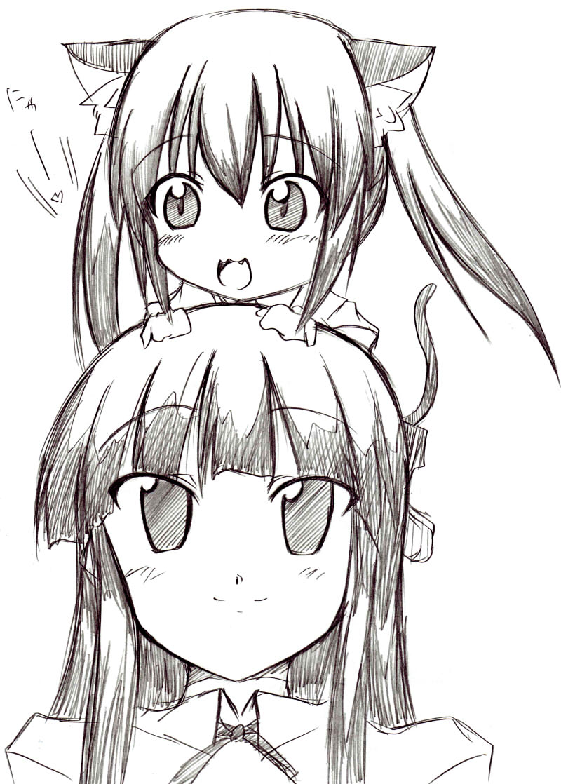00s2girlsanimal earscat earschibigreyscalehappyheartmonochromemultiple girlsschool uniformsketchsmiletsurimetwintails