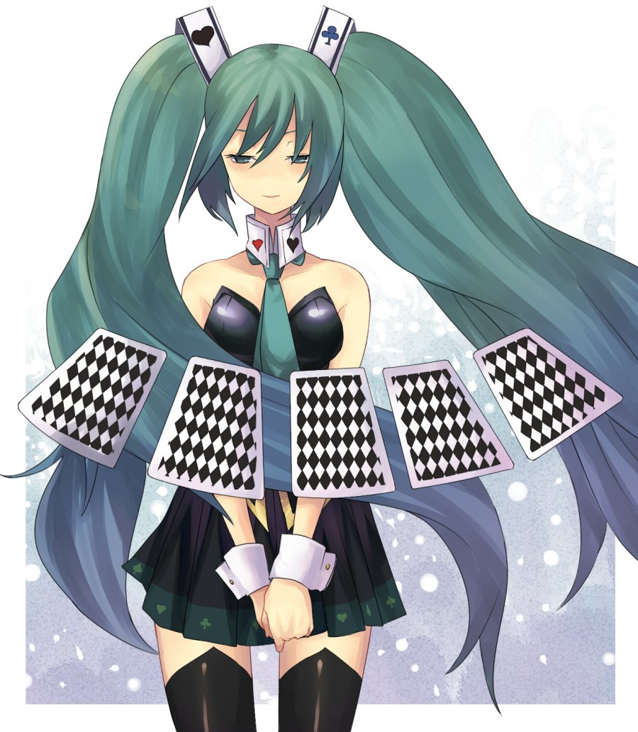 1girlaqua haircardclubsdiamond (gemstone)diamond (shape)female focusfloatingfloating cardgradient hairgreen eyesheartlong hairmulticolored hairsolospadethighhighstwintailsvery long hair