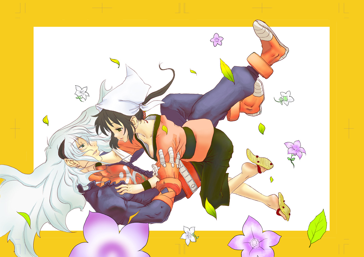 1boy1girlblushbreastsbrown haircleavageglovesheadscarflong hairmedium breastssandalswhite hairwhite headscarf