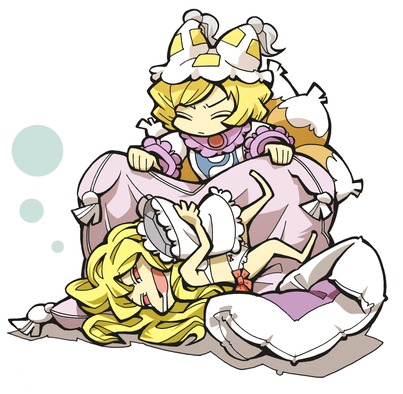 2girlsanimal hatbarefootblonde hairchibiclosed eyescovering with blanketfemale focusfox tailfull bodyhathugging objectlingerielong hairlong sleevesmob capmultiple girlsmultiple tailspillowpillow hugred eyessalivashort hairsimple backgroundsleepingtailtasselunderwearwhite backgroundwide sleeves