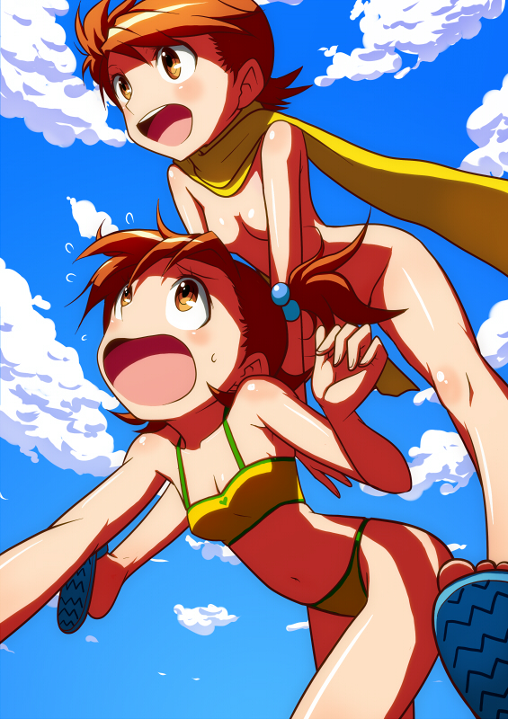00s2girlsbikiniflip-flopsflipped hairjumpingmultiple girlsnaked scarfnudeopen mouthsandalsscarfsiblingssistersswimsuittwins
