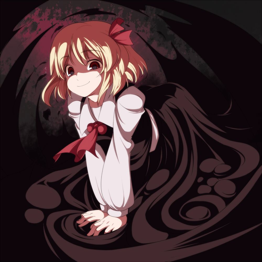 1girlblonde hairdarknessfemale focushair ribbonlooking at viewerred eyesribbonshaded faceshort hairsittingsmilesolo