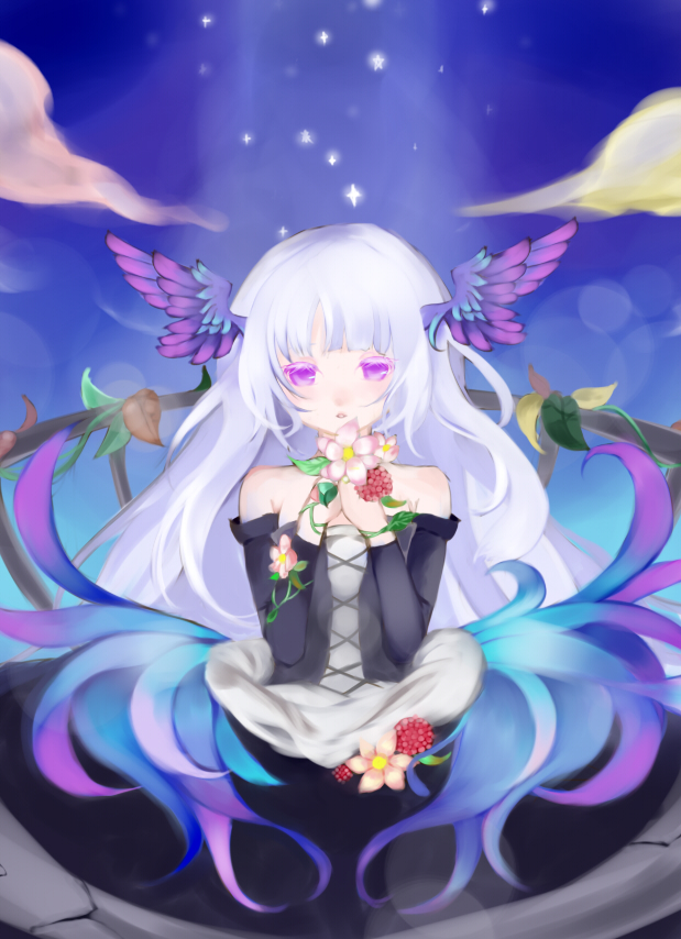 1girldressfemale focusflowerhair downhead wingslong hairpurple eyessolostraplessstrapless dresswhite hairwings