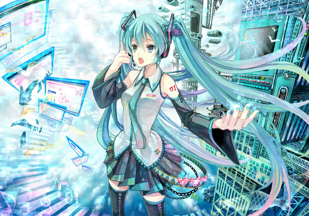 1girlaqua eyesaqua hairbeltbinarychaindetached sleevesfemale focusfloating screenflowerheadsetlong hairmusicnecktieopen mouthsingingskirtsolothighhighstwintailszettai ryouiki
