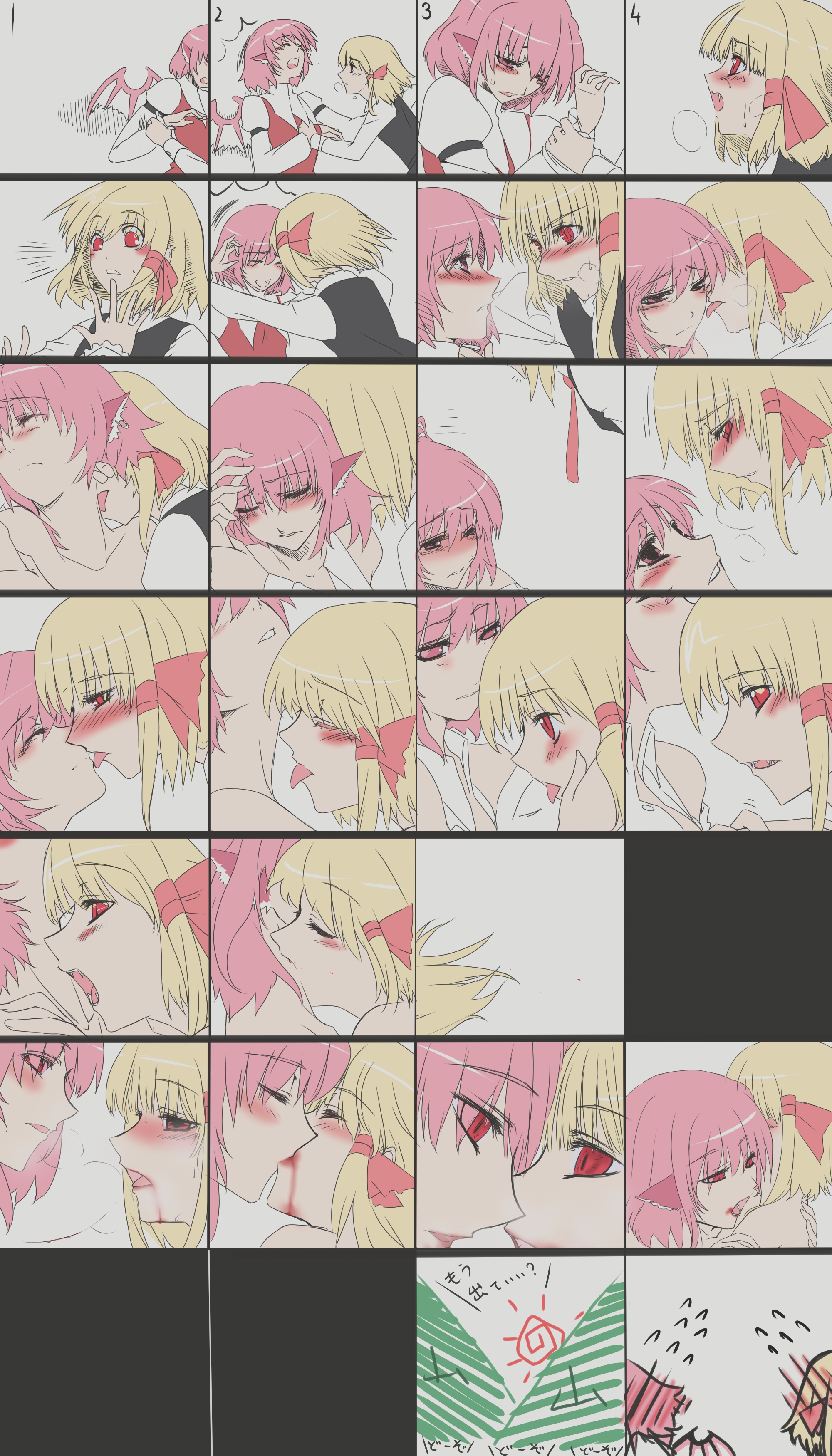 2girlsanimal earsblonde hairbloodblushfangsfemale focushair ribbonkissmultiple girlspink eyespink hairred eyesribbonshort hairsweattopless femalevampirewingsyuri