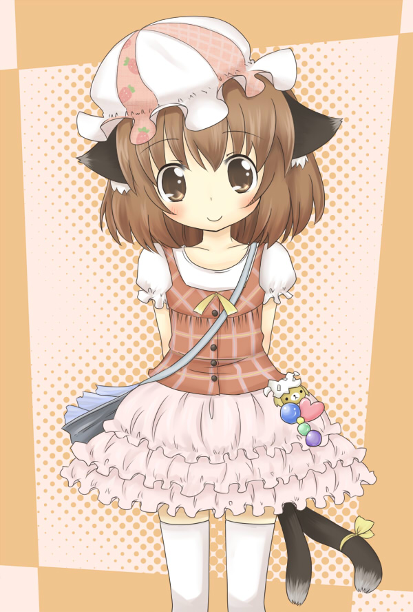 1girlalternate costumeanimal earsarms behind backbagbrown eyesbrown haircasualcat earscat girlcat tailchildcontemporaryfemale focushandbaghatmultiple tailsshort hairsolotailthighhighs