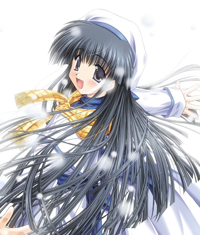 1girlblack eyesblack hairdressfemale focushatlong hairlooking at vieweropen mouthoutstretched armsscarfsnowsolospread arms