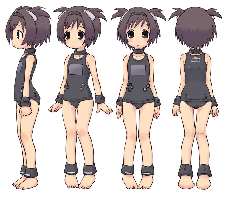 1girlankletassbarefootblack eyesblack one-piece swimsuitblack school swimsuitblushbracerbrown hairchibicollarcollarboned-padflat chestgame boyhair ornamenthairbandhandheld game consolejewelrylolilooking at viewerone-piece swimsuitopen mouthpantiespersonificationproduct girlschool swimsuitshort hairswimsuittwintailsunderwearwhite background