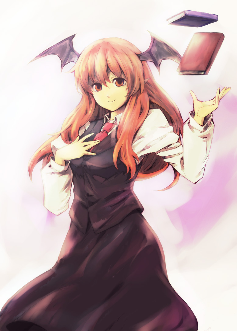 1girlbat wingsbookfemale focushand on own chesthead wingslong hairlong skirtnecktiepointy earsred eyesred hairskirtskirt setsmilesolowings