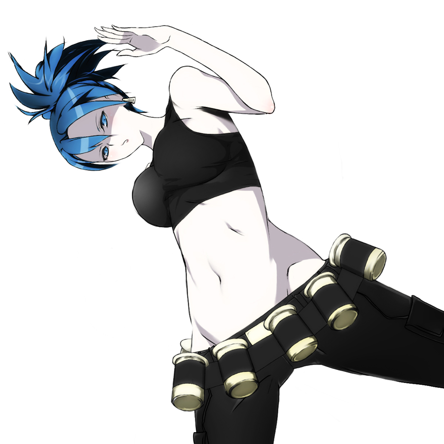 1girlblue eyesblue hairearringsfemale focusglovesjewelrymatching hair/eyesmidriffpale skinponytailsolotank top