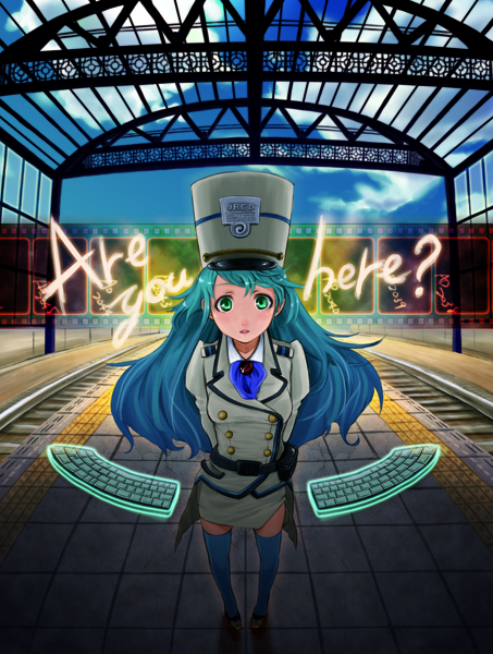 1girlarms behind backblue hairenglish textfemale focusgreen eyeshatlong hairshako capskirtsolotactile pavingthighhighstrain attendanttrain stationtravel attendantzettai ryouiki