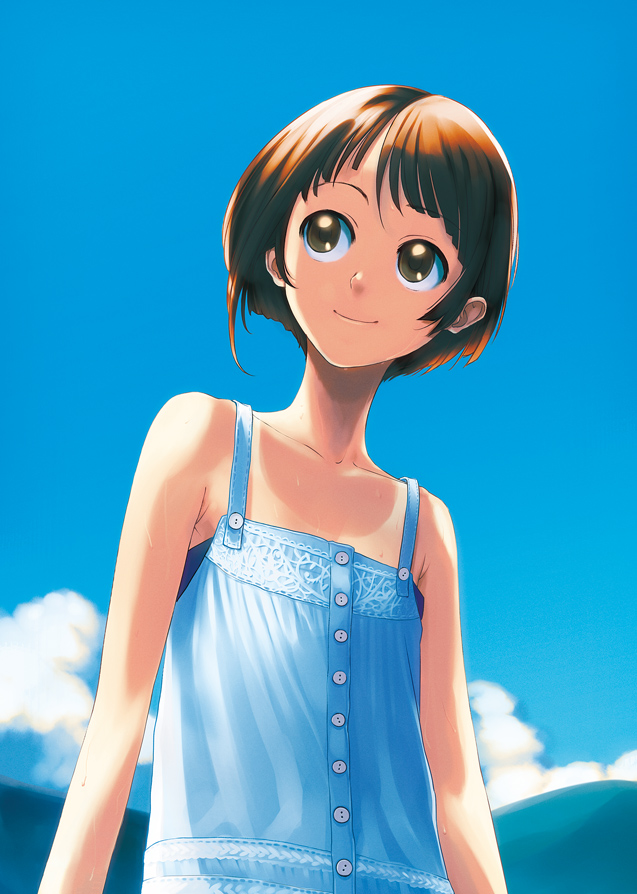 1girlblue dressbrown eyesbrown hairbuttonscamisolechildclouddaydressfemale focusflat chesthappyhead tilthilllooking afarshort hairskysmilesolosundresssweattantanline