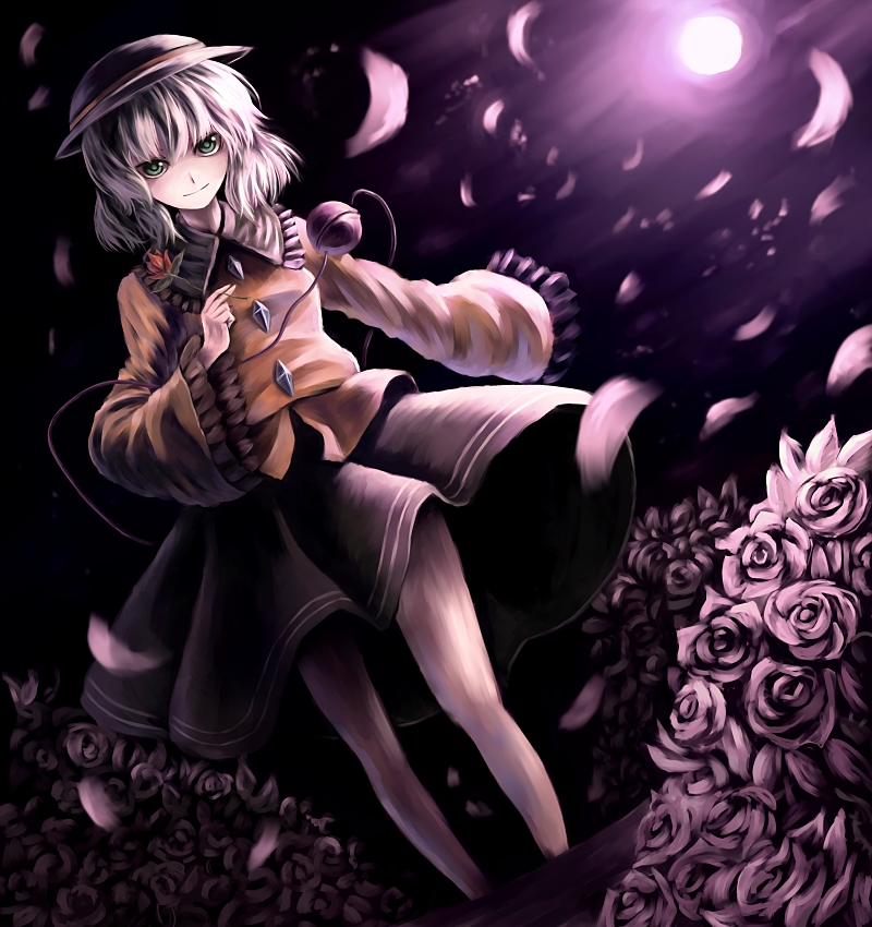 1girldutch anglefemale focusflowerfull moongradient backgroundgreen eyeshatholdingmoonnaturenightoutdoorspetalsplantroseshort hairskirtskysmirksolowide sleeves