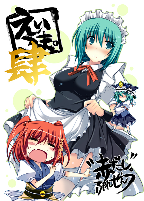:d1boy2girlsalternate costumeapronblushbreastsclosed eyesenmaidedfemale focusgarter strapsgreen eyesgreen hairlarge breastslong sleevesmaidmaid apronmaid headdressmultiple girlsopen mouthred hairskirt holdsmilethighhighswaist apronzettai ryouiki