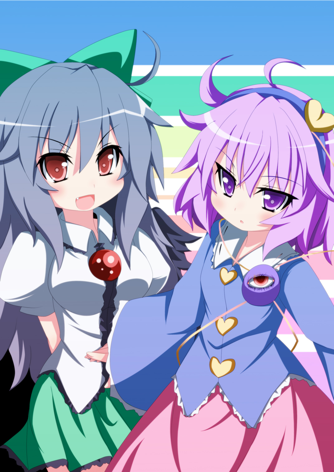 2girlsblack hairbowbreastsfangfemale focushair bowhairbandmultiple girlspurple eyespurple hairred eyesskirt