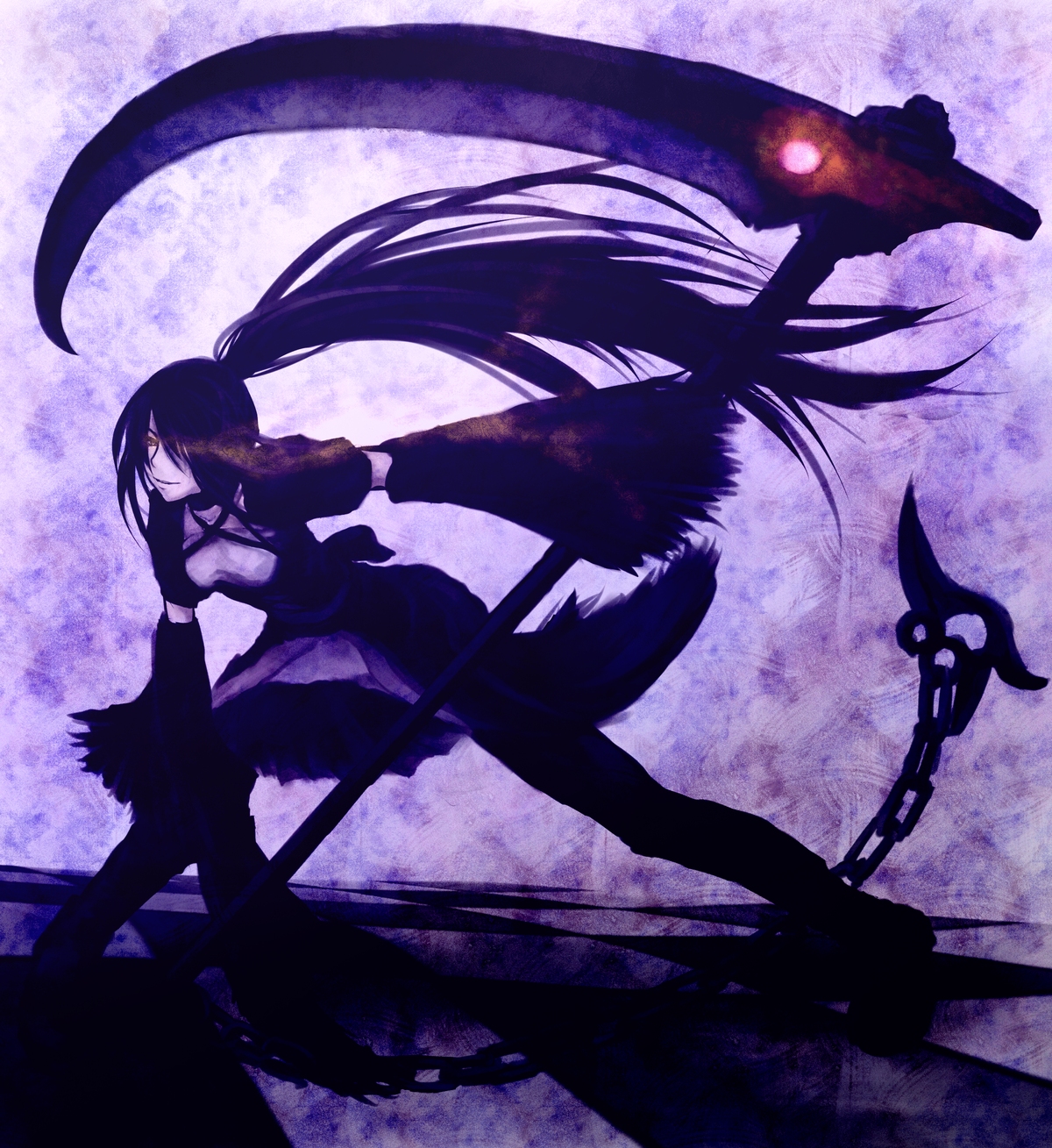 10sblack hairchaincheckered floordetached sleevesdressgothic lolitahair over one eyelolita fashionlong hairpolearmponytailscythesoloweaponyellow eyes