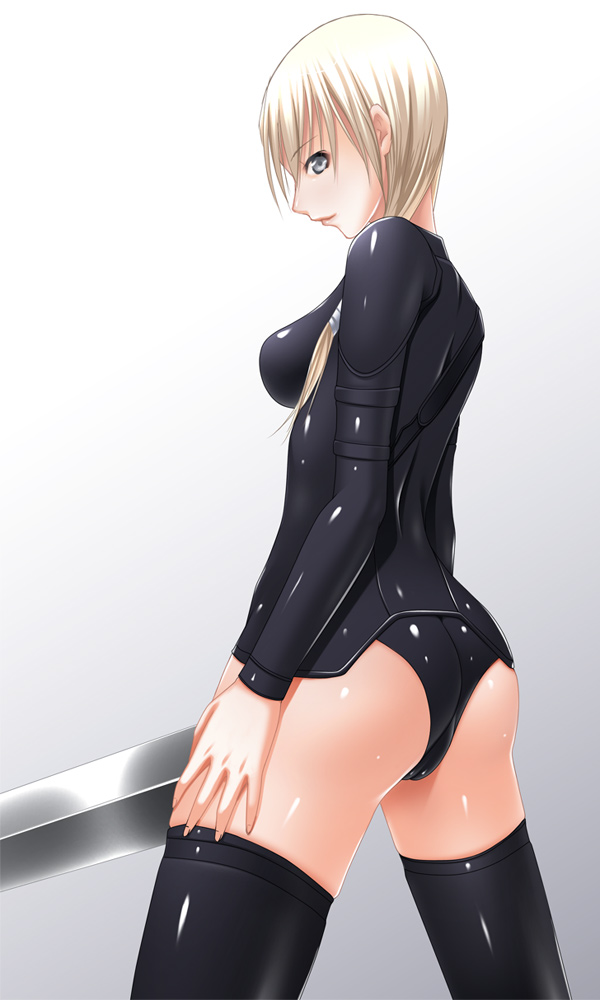 00s1girlassblack thighhighsblonde haircameltoeclaymore (sword)female focusgrey eyeslatexlong hairlooking backskin tightsoloswordthighhighsweapon