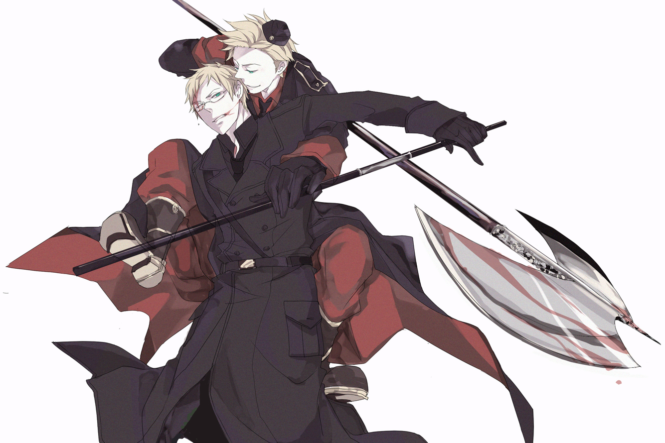 00s2boysaxebeltblonde hairbloodblue eyesbootscoatgarrison capglassesgloveshatmale focusmilitarymilitary uniformmultiple boysnecktiepolearmshort hairsimple backgroundtrench coatweaponwhite background