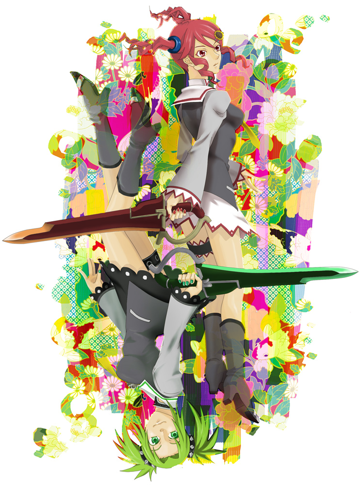 00s2girlsbootschokerflowergreen eyesgreen hairgreen nailshair ornamenthaircliphigh heelsknee bootsminiskirtmultiple girlsnail polishred eyesred hairred nailsrotational symmetryshoesskirtswordtwintailsupside-downweapon