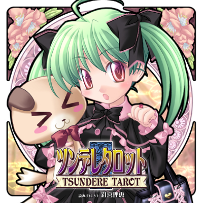 1boy1girlahogeblushcardclosed eyesdogfemale focusfloating cardgothic lolitagreen hairjewelrylolita fashionlong hairred eyessolotsunderetwintails