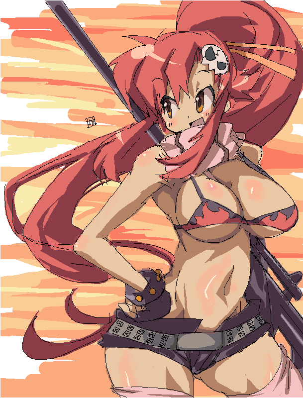 00santi-materiel riflebeltbikinibikini top onlybreastscleavagefingerless glovesglovesgunhair ornamentlarge breastslong hairmidriffoekakiopen mouthpink thighhighsponytailred hairriflescarfshort shortsshortssniper riflesoloswimsuitthighhighsweaponyellow eyes