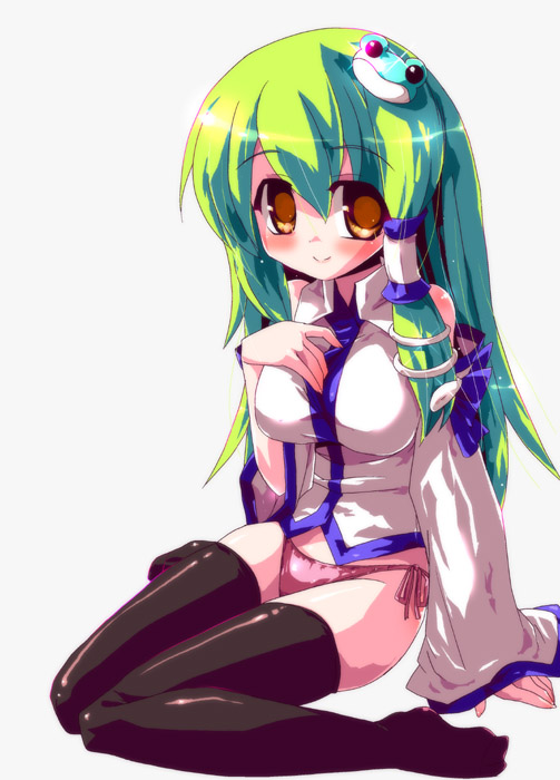 1girlbreastsdetached sleevesfemale focusfroggreen hairhair ornamentlarge breastslong hairno pantsorange eyespantiesside-tie pantiessnakesolothighhighsunderwear