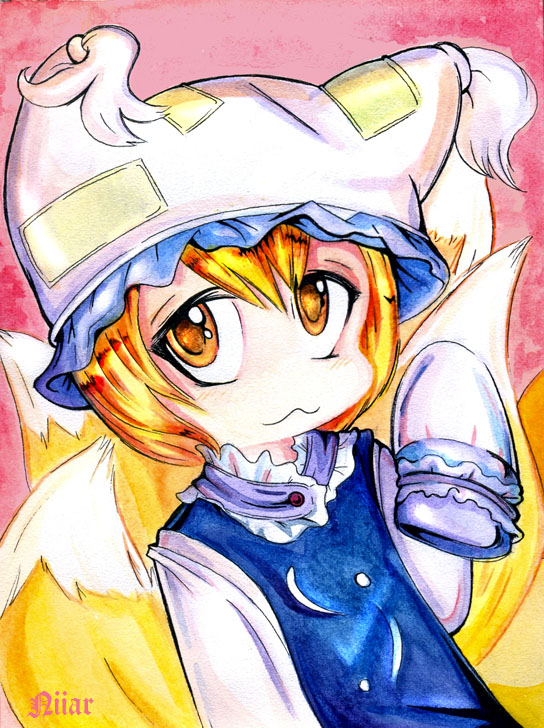 :31girlanimal hatblonde hairfemale focusfox tailhatlong sleevesmob capmultiple tailspink backgroundshort hairsleeves past wristssolotailtasselyellow eyes