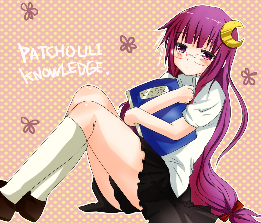 1girlalternate costumebespectacledblushcharacter namecontemporarycrescentcrescent hair ornamentfemale focusglasseshair ornamenthair ribbonlong hairpurple eyespurple hairribbonschool uniformskirtsolovery long hair