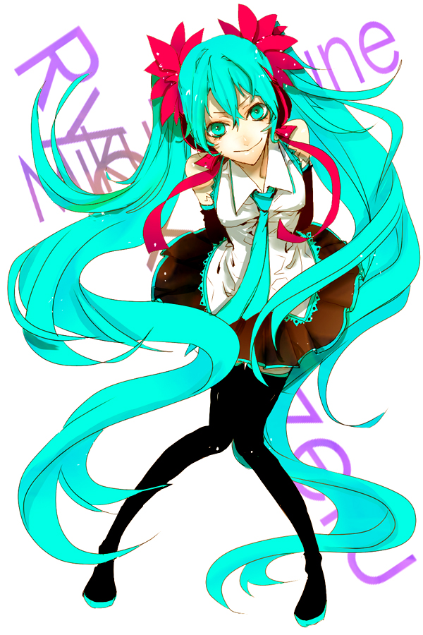 aqua eyesaqua hairdetached sleeveshair ribbonheadphoneslong hairribbonskirtsmilethighhighstwintailsvery long hairzettai ryouiki