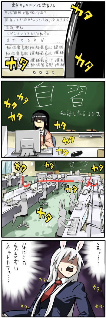4komaanimal earsblack hairblazercomiccomputercomputer keyboardfemale focusjacketpurple hairrabbit ears