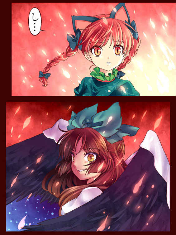 animal earsbowbraidbrown haircapecat earscat girlcomicextra earsfemale focushair bowhair ribbonlong hairmultiple hair bowsred eyesred hairribbonshort hairslit pupilstwin braidstwintailswingsyellow eyes