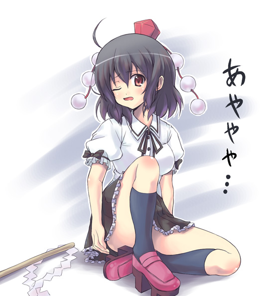 1girlahogeblack hairfemale focusgetagoheihatlooking at vieweropen mouthorange eyesshort hairsockssolotengu-getatokin hatwince