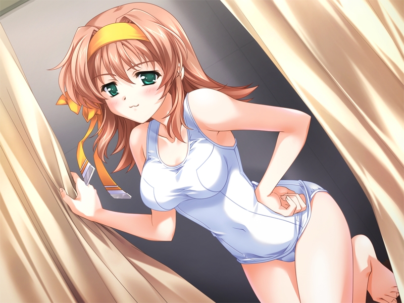 :31girlbarefootcurtain grabcurtainsdressing roomfemale focusgreen eyeshair ribbonhairbandlong hairone-piece swimsuitorange hairribbonschool swimsuitsoloswimsuitwhite one-piece swimsuitwhite school swimsuit
