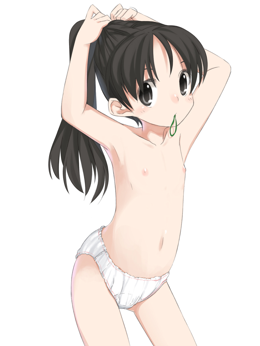 1girladjusting hairarmpitsarms upblack hairfemale focusflat chestlolilong hairmouth holdnavelnipplespantiesponytailsolotopless femaleunderwear