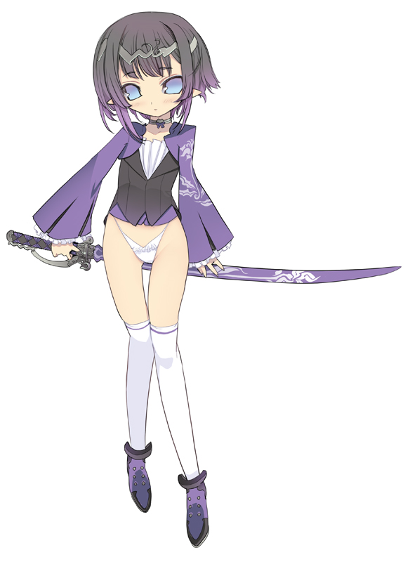 1girlblack hairblue eyesblushbob cutchokerfemale focusno pupilspantiespointy earsshort hairsoloswordthighhighsunderwearweapon