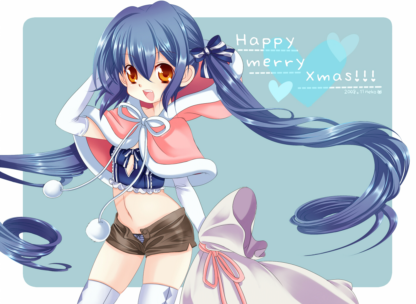 00s2008blue hairbowbow pantiesbrown eyeschristmascleavage cutoutclothing cutoutelbow glovesfanggloveslong hairnavelopen flypantiessacksanta costumeshort shortsshortssolostriped clothesstriped pantiesthighhighstwintailsunbuttonedunderwearunzipped