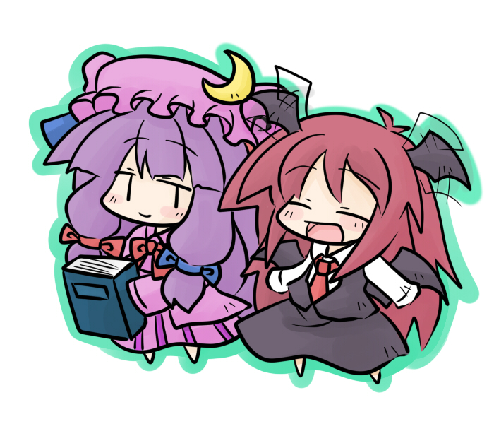 :d1boy2girlsbat wingsblunt bangsblush stickersbonnetbookchibiclosed eyescrescentdressdress shirtfemale focusflappinghair ribbonhappyhathead wingshime cutlong hairlong sleevesmultiple girlsnecktieopen mouthpurple dresspurple hairred hairribbonshirtsidelocksskirtskirt setsmilestriped clothesstriped dressvery long hairvestwings