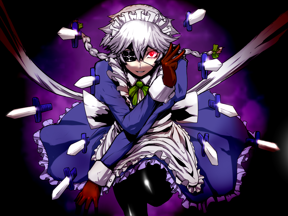 1girlblack pantyhosebraideyepatchfemale focusgloveshairbandknifepantyhosered eyesshort hairsolothrowing knifetwin braidsweapon