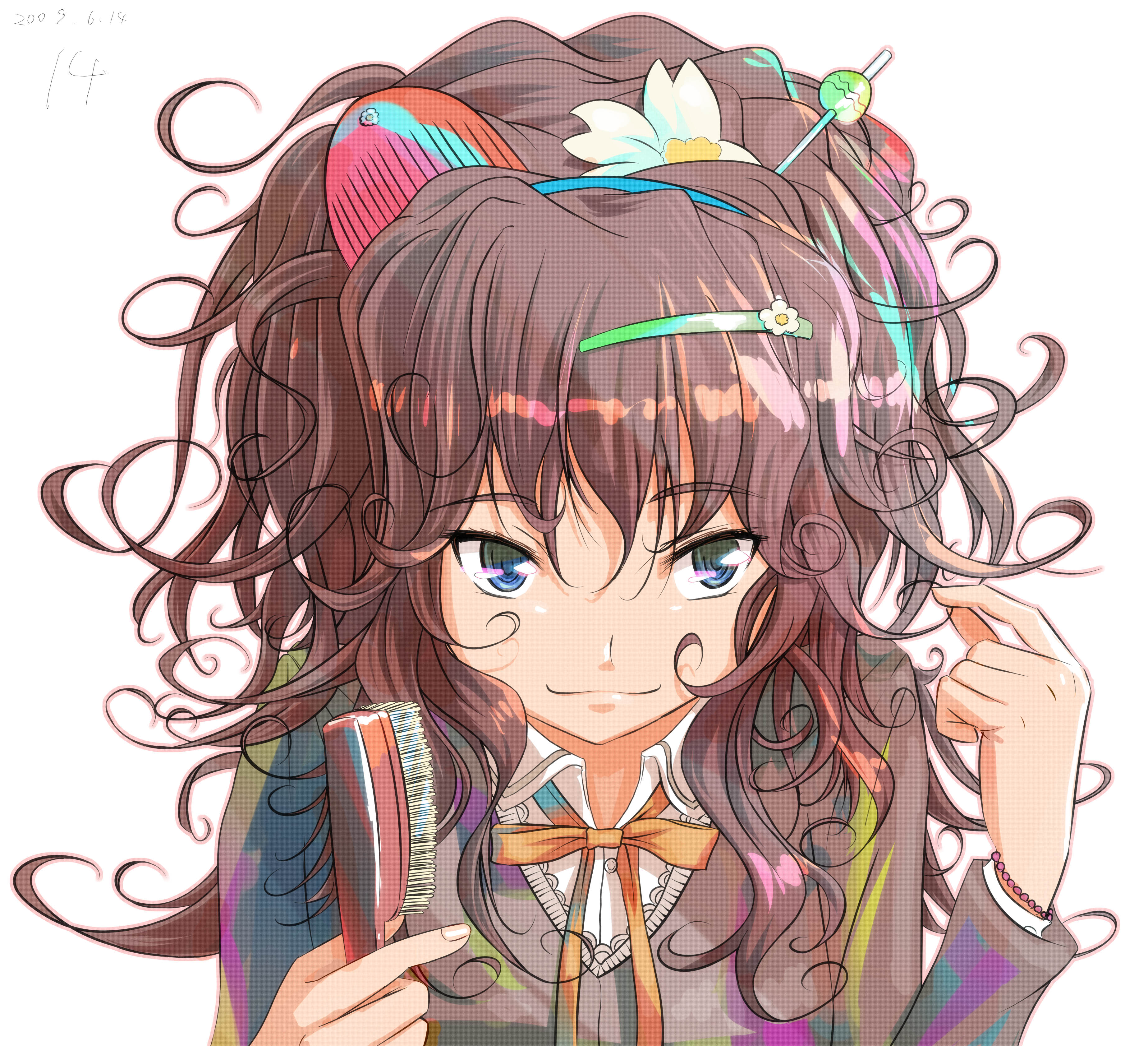 :31girlblue eyesbraceletbrown haircombfemale focusflowerhair brushhair flowerhair ornamenthairclipjewelrylong hairmessy hairribbonschool uniformsmilesolo