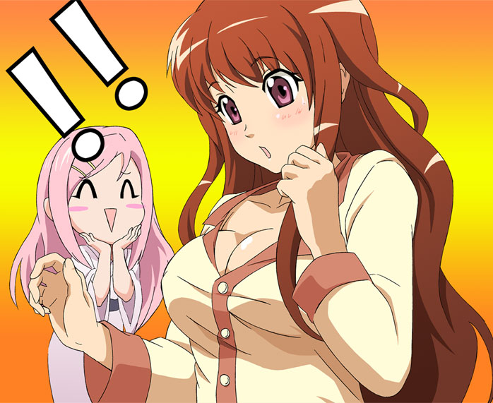 1boy2girlsblushbreastsbrown haircleavagejapanese clotheslarge breastslong hairmultiple girlspajamaspurple eyes
