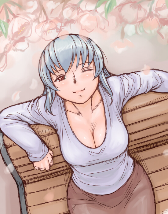 00s1girlaged upbenchbreastscasualcherry blossomscleavagedress shirtfemale focuslarge breastsnecktieone eye closedpetalspink eyesshirtsolosurprisedwink