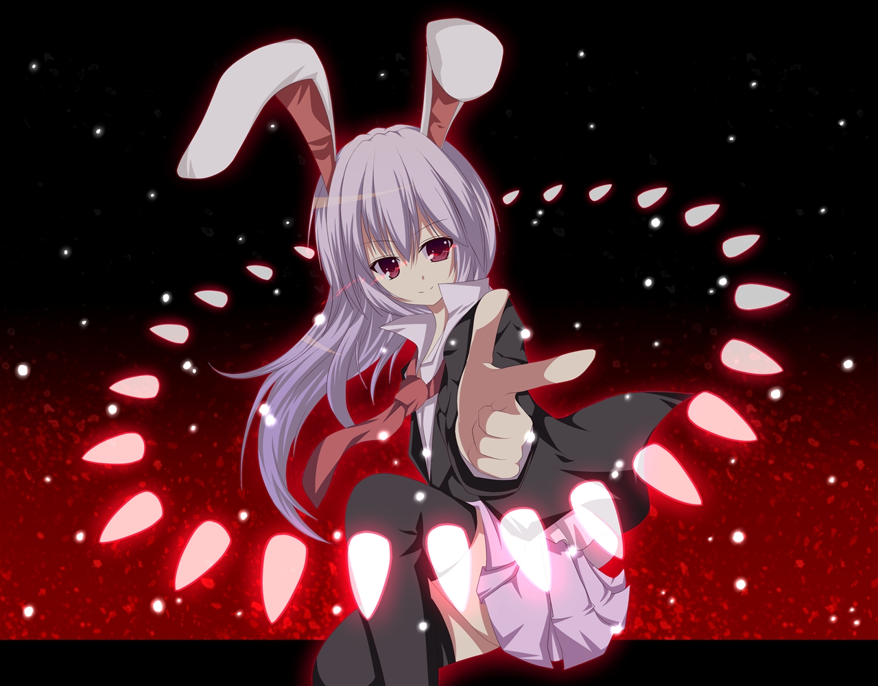 1girlanimal earsblazerbulletdanmakufemale focusfinger gunglowingglowing eyesjacketlong hairnecktiepurple hairrabbit earsred eyesred necktieskirtsolothighhighs