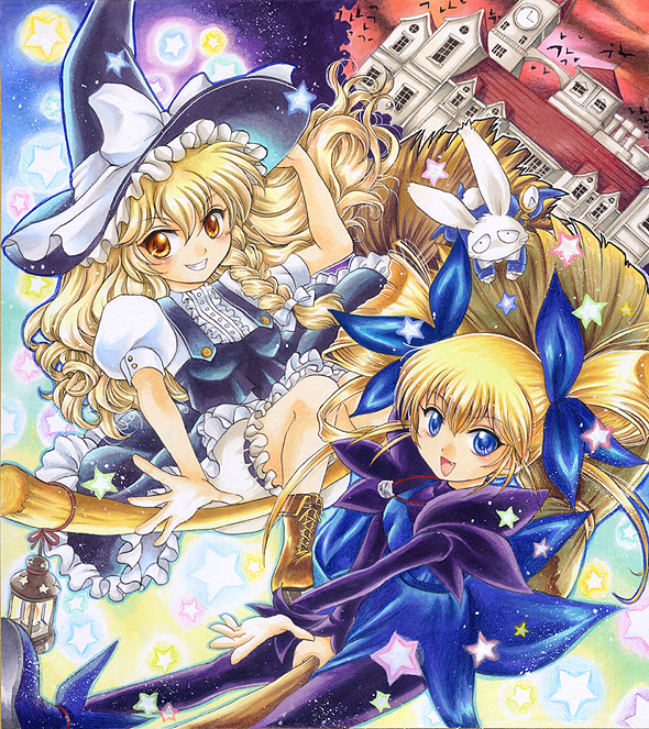 2girlsblonde hairbroombroom ridingcrossoverfanghatmultiple girlspantyhoseparodypom pom (cheerleading)rabbitscarlet devil mansionstar (symbol)twintailswitchwitch hat