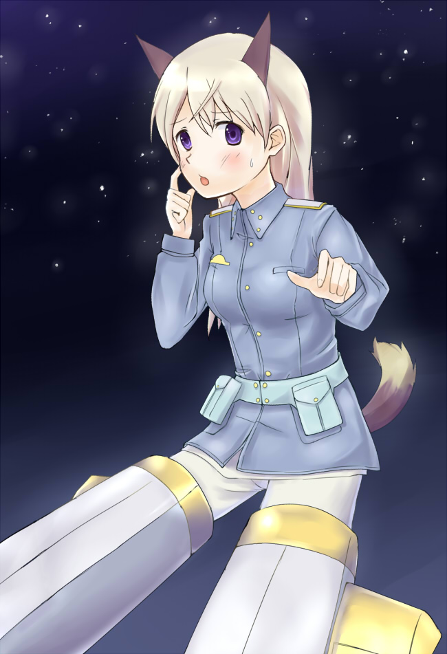 00s1girlanimal earsblonde hairblue eyesblushfemale focuslong hairmilitarymilitary uniformpantyhoseskysolostar (sky)star (symbol)starry skystriker unittailwhite pantyhose