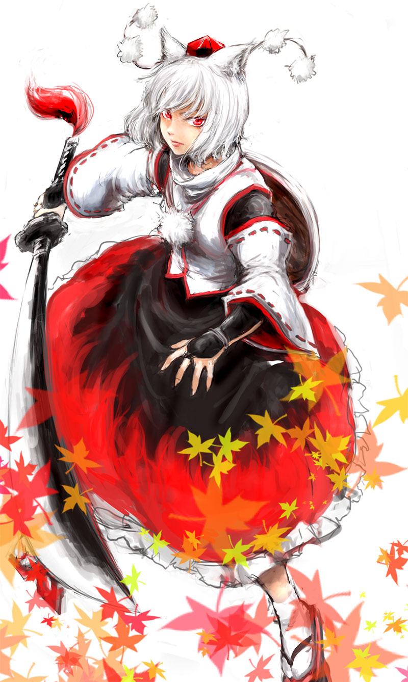 1girlanimal earsdetached sleevesfemale focusgetahatleafred eyesshieldshort hairsoloswordtailtengu-getatokin hatweaponwolf earswolf tail
