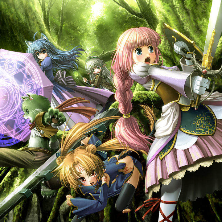 animal earsblue eyesblue hairbraidcat earsfurryfurry femalegreen eyesmagic circlepink hairpointy earsswordthighhighsumbrellaweapon