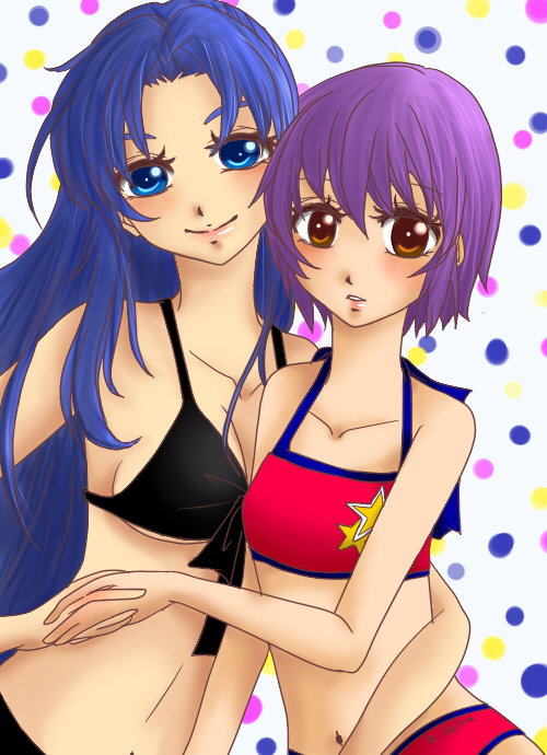 00s2girlsbikiniblue eyesblue hairgrey hairlong hairmultiple girlsshort hairswimsuityellow eyes