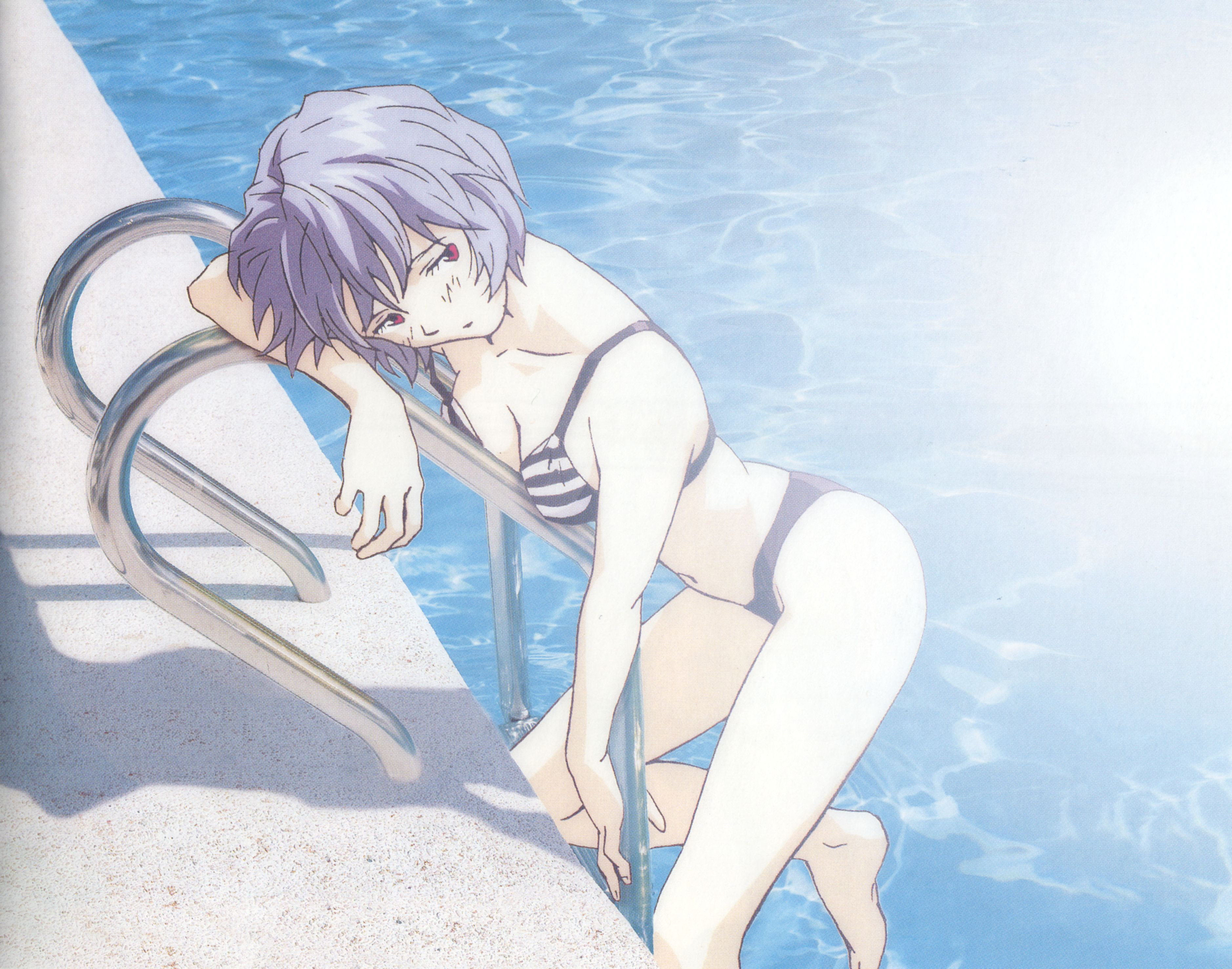 1girlbarefootbikiniblue hairbreast pressbreastscleavagefemale focusleaning forwardmedium breastsnavelpale skinphoto backgroundpoolpool ladderpoolsidered eyesshadowshort hairsolostriped bikinistriped clothessunlightswimsuit